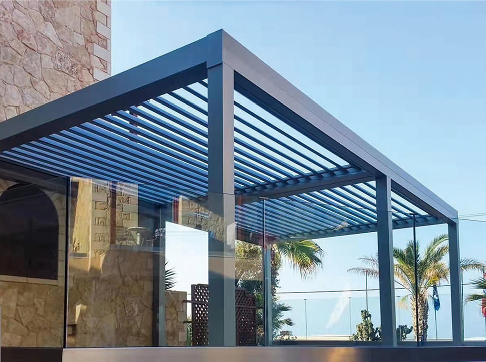 涼亭采用高強度鋁合金簾片,通過電機遙控裝置可以輕松實現從0度到135度的自由翻轉。