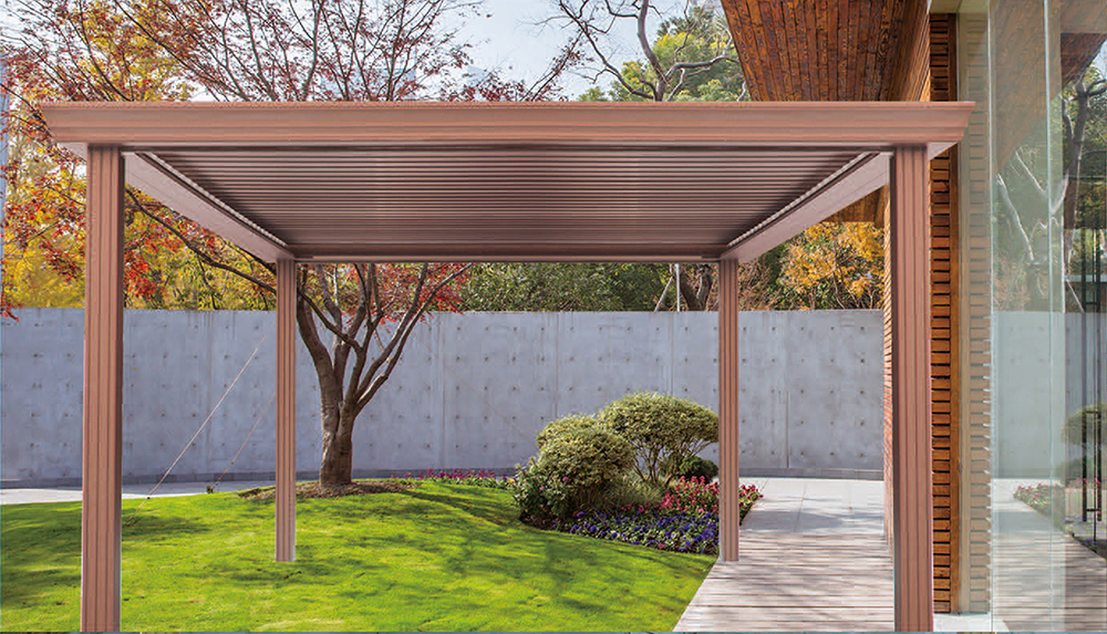 電動遮陽防雨百葉涼亭,葉片采用鋁合金6063材質整體擠壓成型,葉片表面帶有水溝,在葉片關閉時可引導雨水進入兩頭的引水槽,再接入排水管。